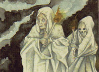 | Mitología y Creencias Populares Aún durante el siglo VI de nuestra Era, Martín Dumiense en su "Correctione Rusticorum" condenaba la costumbre de los ástures de poner velas en las fuentes, árboles y cruces de caminos, así como de adorar a las piedras, siendo todos ellos lugares donde se manifestarían las divinidades. Según se fue consolidando el cristianismo, las viejas deidades quedaron arrinconadas como mitos y supersticiones, aunque se mantendrían con esa consideración y con fuerza hasta bien entrado el siglo XX. Largo y trabajoso fue el proceso cristianizador de Asturias. Mientras que las clases señoriales y cultas abrazaban con entusiasmo la fe oficial, el pueblo mantenía un sincretismo religioso que se reflejaba en todas las manifestaciones de su mundo espiritual, pues lo mismo que sucedió con la romanización, la Iglesia fue adaptando el proceso cristianizador a las condiciones de cada sociedad. Asi tenemos como los viejos lugares sagrados son transformados en lugares de culto por la nueva religión: montes, fuentes, cruces de caminos, cuevas, dólmenes y hasta castros acogen ermitas, capillas, cruces o cruceros, símbolos visibles del reinado de Cristo en la tierra. Esta persistencia de las antiguas creencias se ve en los escritos del Obispo Aponte de Quiñones, que en el siglo XIV afirmaba que la fe cristiana "se mantenía de milagro en las Asturias rodeada de la común ignorancia". O como en el siglo de las luces, el XVIII, el Obispo González Pisador elabora unas "Constituciones Synodales del Obispado de Oviedo", con el fin de erradicar la liberalidad de las costumbres sexuales de los asturianos de la época y los restos del paganismo panteista que todavía sobrevivía entre la gente del viejo Principado. Este sistema mítico asturiano está emparentado con sus homólogos de la Europa Atlántica en la que, como afirma Ramón Baragaño "predomina la raigambre céltica". Y dentro de este sistema, es necesario hacer una referencia a los seres míticos asturianos, quizás su elemento más popular. Son seres que habitan junto con los asturianos toda la geografía mítica del País: seres relacionados con fuentes y cuevas (la xana, el cuélebre), con la mar (el pataricu, la serena,l'home marín), con el bosque (el busgosu o mofosu), con el hogar y la actividad humana (el trasgu, el sumiciu), con la muerte (el güercu, la güestia, la guaxa, el carru la muerte), sin función determinada (el diañu burllón, el pesdiellu,l'home Ilobu). Son seres que junto animales con virtudes humanas y a veces mágicas, pueblan la rica literatura popular asturiana, trasmitida a través de los siglos en los labios de los hombres y las mujeres de esta tierra. Anterior / Siguiente |