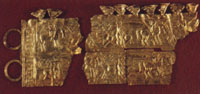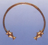 Fer. Orfèvrerie et objets de parure Dans un pays si abondant en or que les Asturies à l'Âge du Fer il a dû y avoir forcement un corps d'orfèvres spécialistes en sa transformation et élaboration, ceci se remarque sur les restes qui nous sont parvenus. Les techniques remarquées sur ces pièces vont de l'estampillage en lame d'or et de la fonte à la cire perdue, aux plus évoluées de la filigrane. Cette orfèvrerie asture présente trois importants genres de pièces: les plaques estampillées, qui seraient placées sur un support d'un matériel différent (le cuir, par exemple), et qu'on a interprétées en tant que diadèmes ou en tant que plaques pour la ceinture. Il y en a qui sont vraiment remarquables comme celle de Cangas de Onís, celle de Vegadeo et celle de Moñes (Piloña), qui est divisée en morceaux. Les torques constituent un autre groupe de pièces, colliers rigides finis en double scotie, objets distinctifs de la noblesse et de grands guerriers; il faut remarquer celles dénommées de Cangas de Onís, celle de Langreo, celle de Valentin de Coaña et celle de Tineo, qui fut fondue pendant la guerre civile mais qu'on connaît grace à une photo. Il faudrait ajouter aux plaques et aux torques toute une série de productions qui d'elles mêmes représentent une catégorie: des broches, des bracelets, des breloques, des amulettes, des disques, des boucles d'oreille... qui nous renvoient á l'existence de des élites princières qui sont au-delà de l'organisation de la gens et qu'on ne peut pas encore définir à présent. |